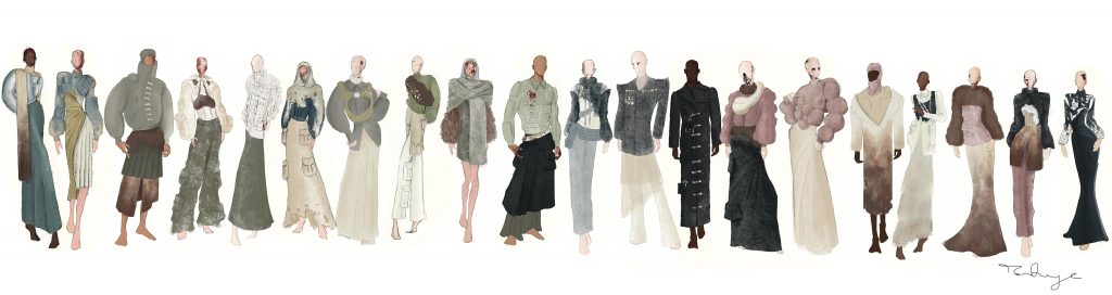 Historical silhouettes are deconstructed to reveal what lies beneath: raw seams, disfigured surfaces, and excessive closures express a longing for control amid collapse.